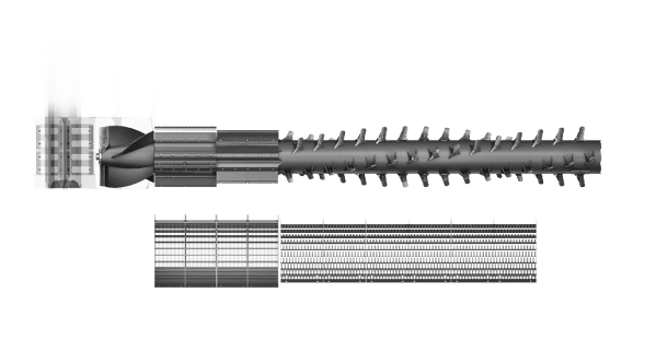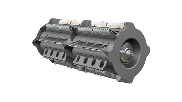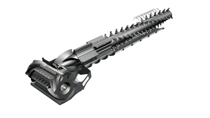 El inversor especialmente diseñado garantiza el máximo rendimiento y el mejor escape. El material se trilla mediante un tornillo sinfín y se transfiere al fondo de retorno. Como resultado, no se desperdicia potencial de separación en el procesador. La trilla se realiza entre el sinfín y las tapas intercambiables, que son dentadas o lisas, según la intensidad deseada.