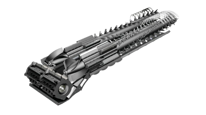 Todos los componentes de los rotores, como las barras de impacto y los dedos del rotor, están dispuestos en cuatro filas como una estructura de hélice. La parte delantera de los rotores consta de cuatro barras de impacto instaladas longitudinalmente, que liberan los granos de las mazorcas. Los cestos subyacentes están disponibles en diferentes diseños para obtener los mejores resultados en cada aplicación. Se pueden sustituir rápida y fácilmente desde el lateral según la aplicación. La distancia de un cesto se ajusta hidráulicamente, como máximo 35 mm. Los dedos del rotor están inclinados hacia atrás en 20°. De este modo, el producto se divide en las secciones de la hélice y se conduce de forma segura y suave alrededor del rotor. De esta manera, no se producen picos de carga inesperados en el rotor y no hay bordes donde se acumule material.