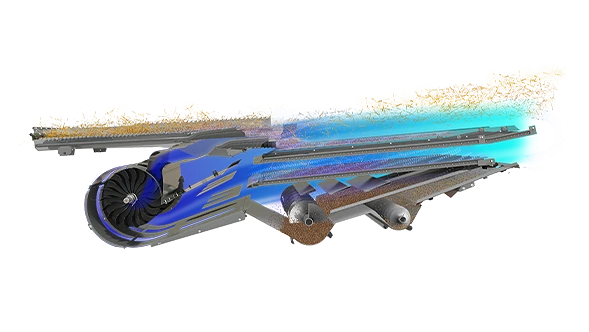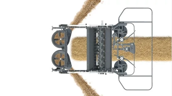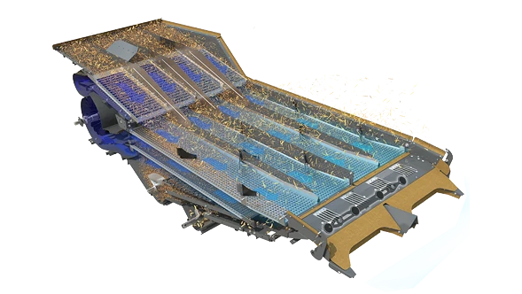 El potente ventilador de limpieza Cyclone consta de tres unidades de soplador con lados abiertos para un máximo flujo de aire. La velocidad del ventilador se puede ajustar hidráulicamente entre 250 y 1400 rpm. Como resultado, se pueden alcanzar diferentes velocidades de forma rápida y eficiente. El fuerte flujo de aire se divide desde la primera etapa de caída. De este modo, se genera un flujo de aire sin salida a lo largo de toda la caja de la criba, lo que garantiza los mejores resultados de limpieza.