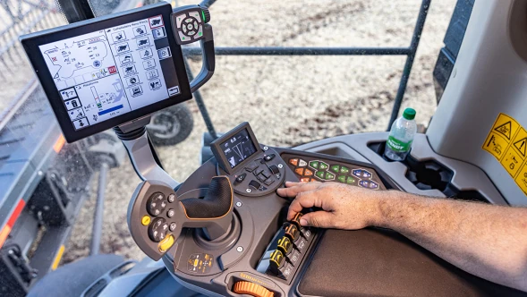 El elemento clave del manejo sencillo e intuitivo del Fendt IDEAL reside en el reposabrazos. Aquí se encuentran el práctico joystick y los botones de operación y conmutación para las funciones de la máquina. También hay una pequeña pantalla digital para los ajustes más importantes. El terminal Vario de 10,4″ permite ajustar fácilmente la máquina con solo tocar un botón o con un dedo.